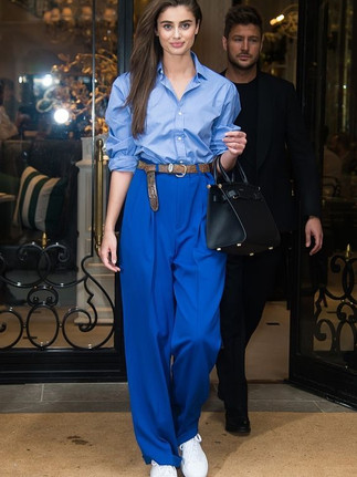 Enquanto os tons mais distantes. e opostos ao azul, como: amarelo e laranja em suas versões mais brilhantes terão a capacidade de criar looks mais criativos e joviais.